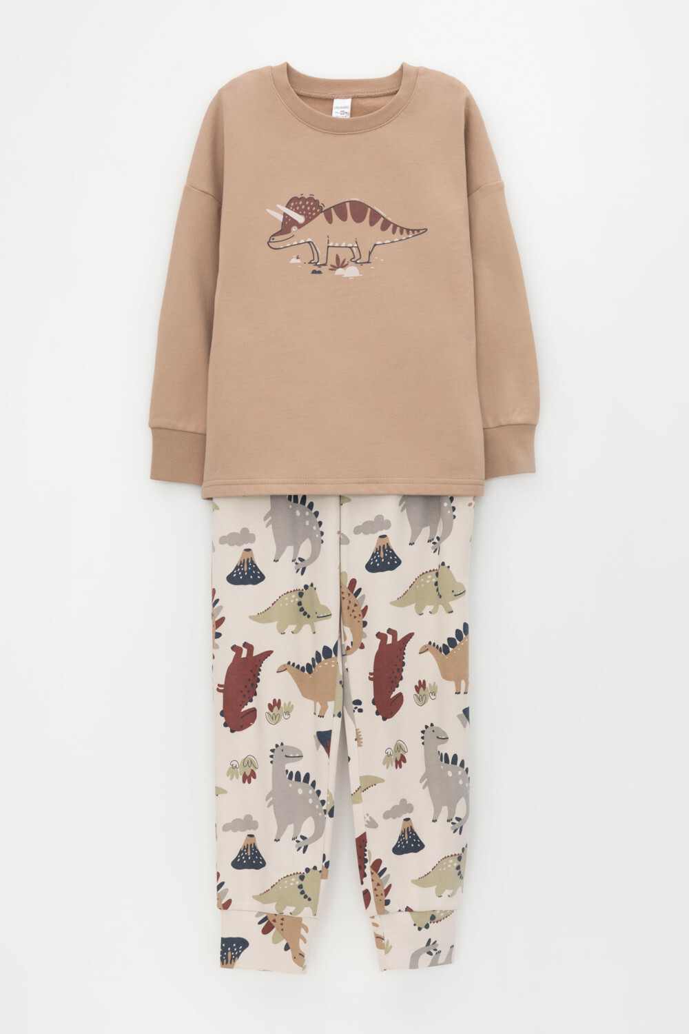 Трикотажный пижамный комплект из футера с начёсом, произведённого из натурального хлопка. У джемпера длинные рукава со спущенными плечами и эластичная мягкая горловина и манжеты. Брюки с удобным поясом на резинке, внизу манжеты. Оригинальные набивка и принт выполнены из стойких, гипоаллергенных текстильных красителей. Все трикотажные полотна производятся в соответствии с нормами Швейцарского сертификата ЭкоТекс.