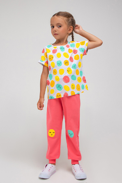 Брюки с резинкой в поясе. Сшиты из однотонного трикотажа футер петля с принтом на коленях в виде цветных шариков. Пояс регулируется по ширине с помощью ленты. Внизу эластичные манжеты. По бокам два удобных кармана.