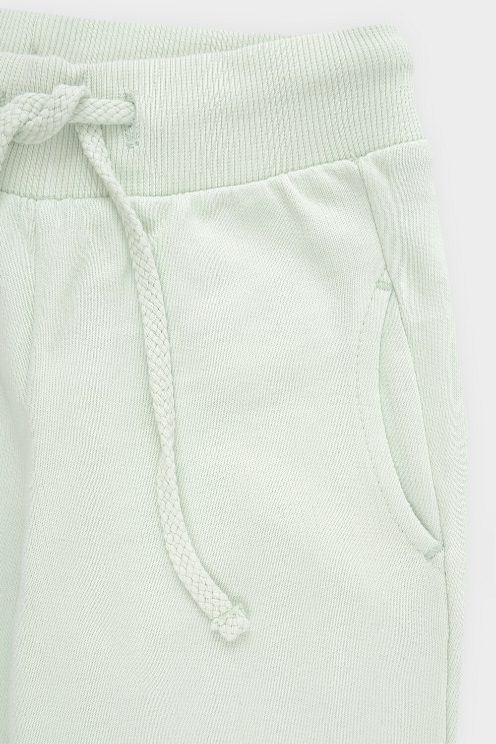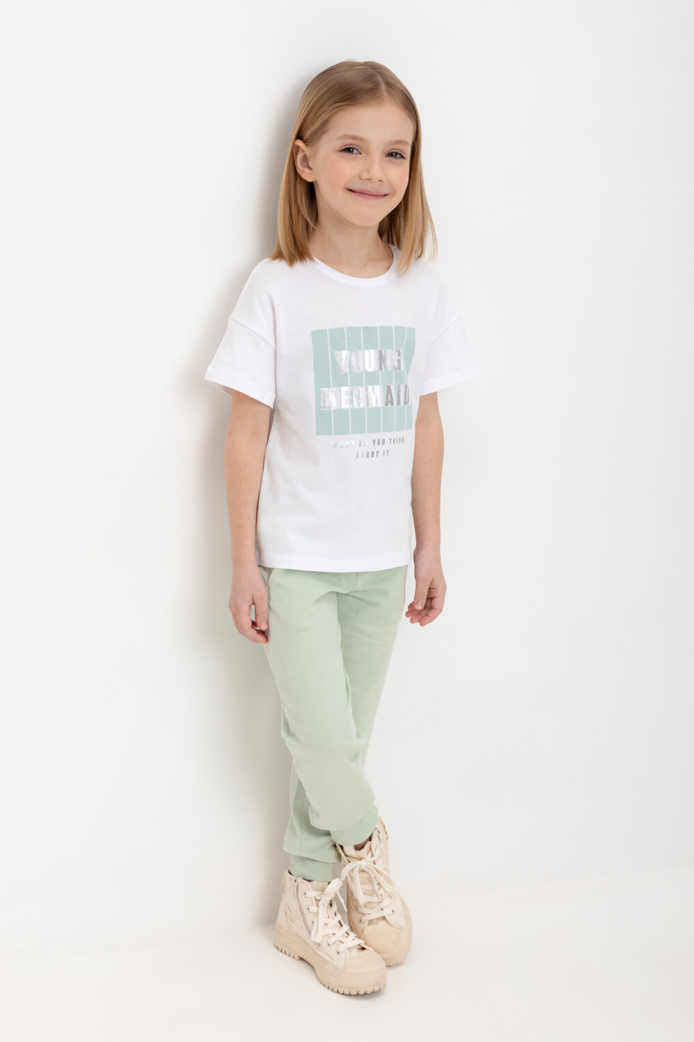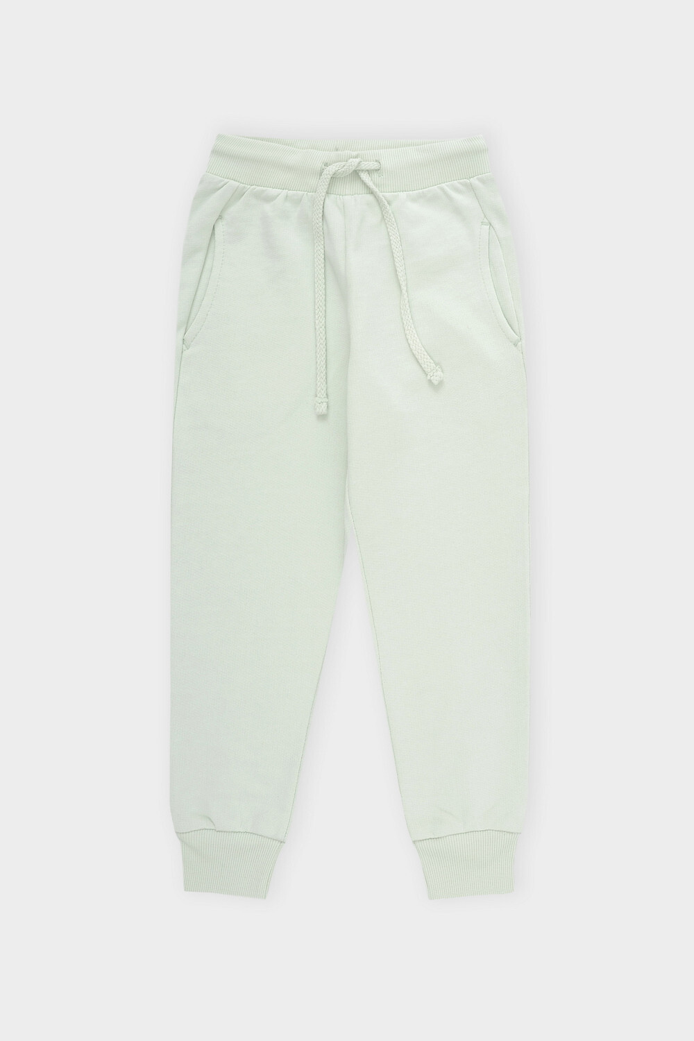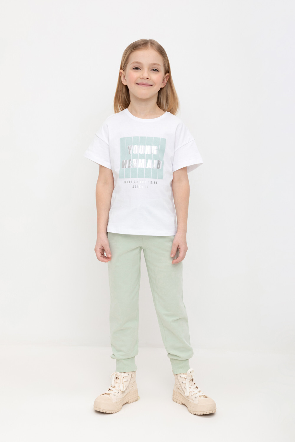 Трикотажные брюки для девочки из петельчатого футера. Эластичный пояс на резинке регулируется по ширине с помощью шнурка, по бокам два удобных кармана, внизу эластичные манжеты.