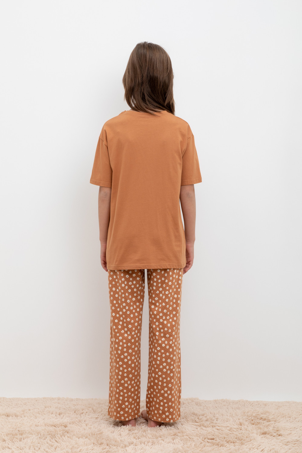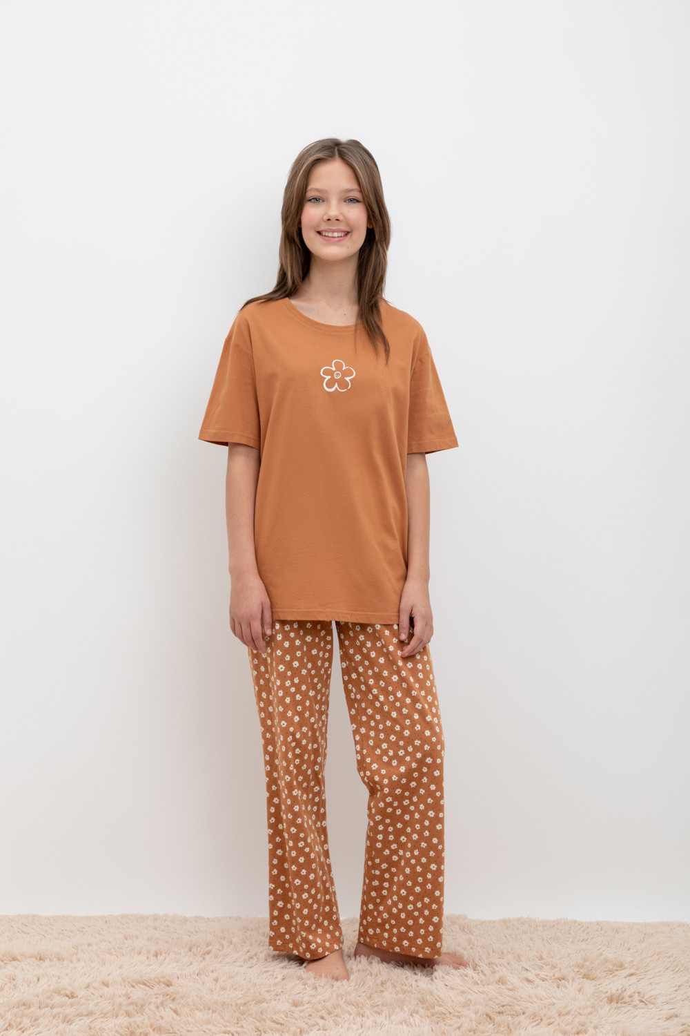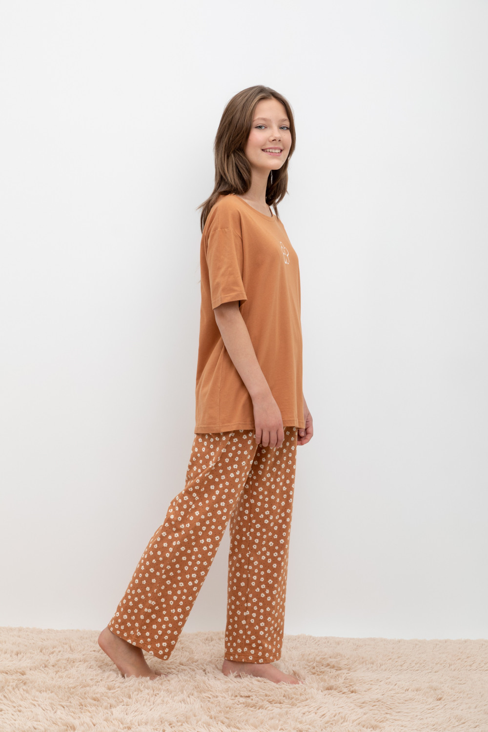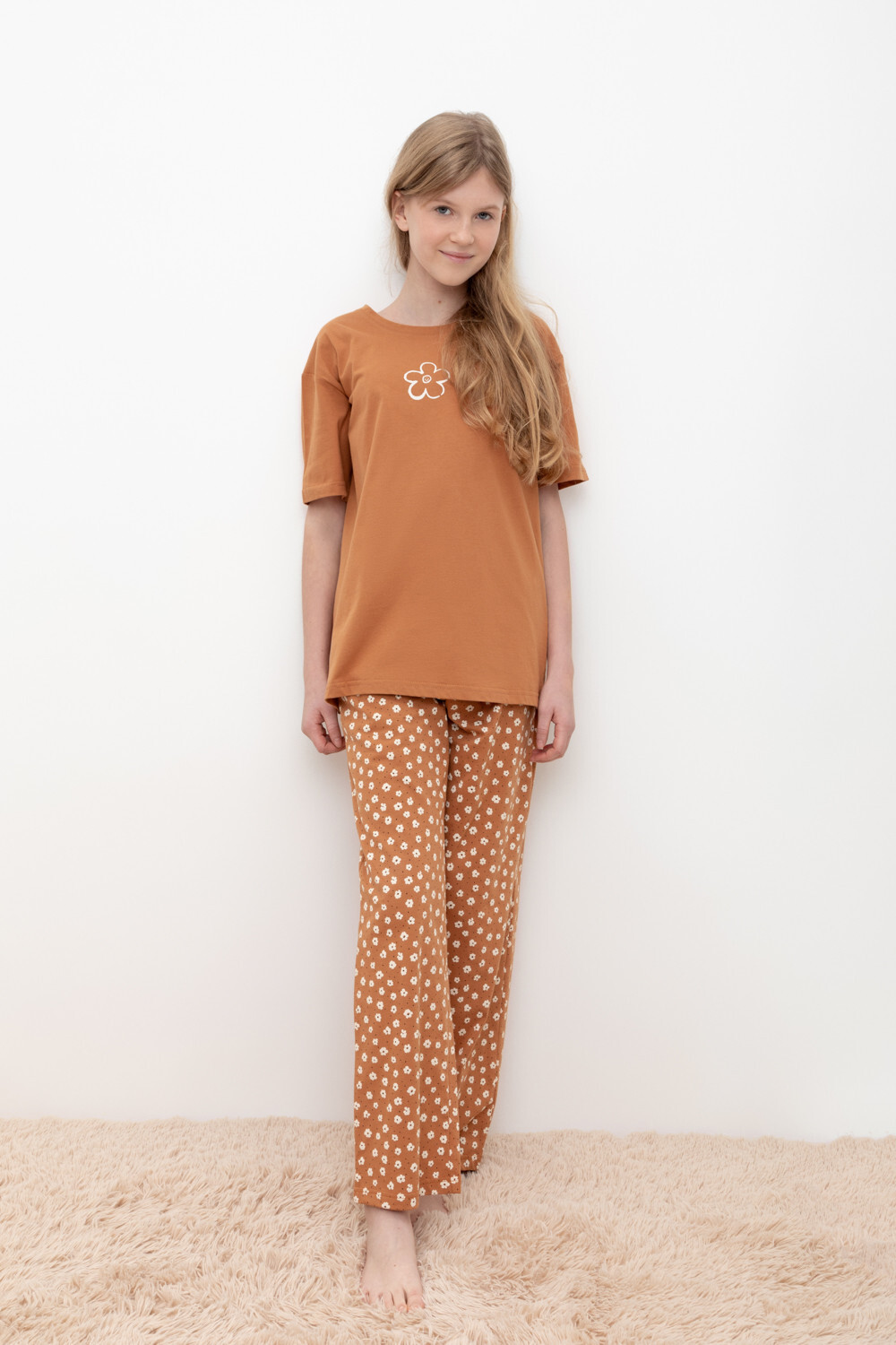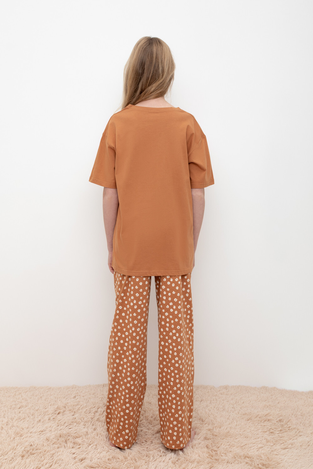 Трикотажный пижамный комплект из натурального хлопка. У футболки короткие рукава со спущенными плечами. Брюки с удобным поясом на резинке. Оригинальная набивка и принт выполнены из стойких, гипоаллергенных текстильных красителей. Все трикотажные полотна производятся в соответствии с нормами Швейцарского сертификата ЭкоТекс.