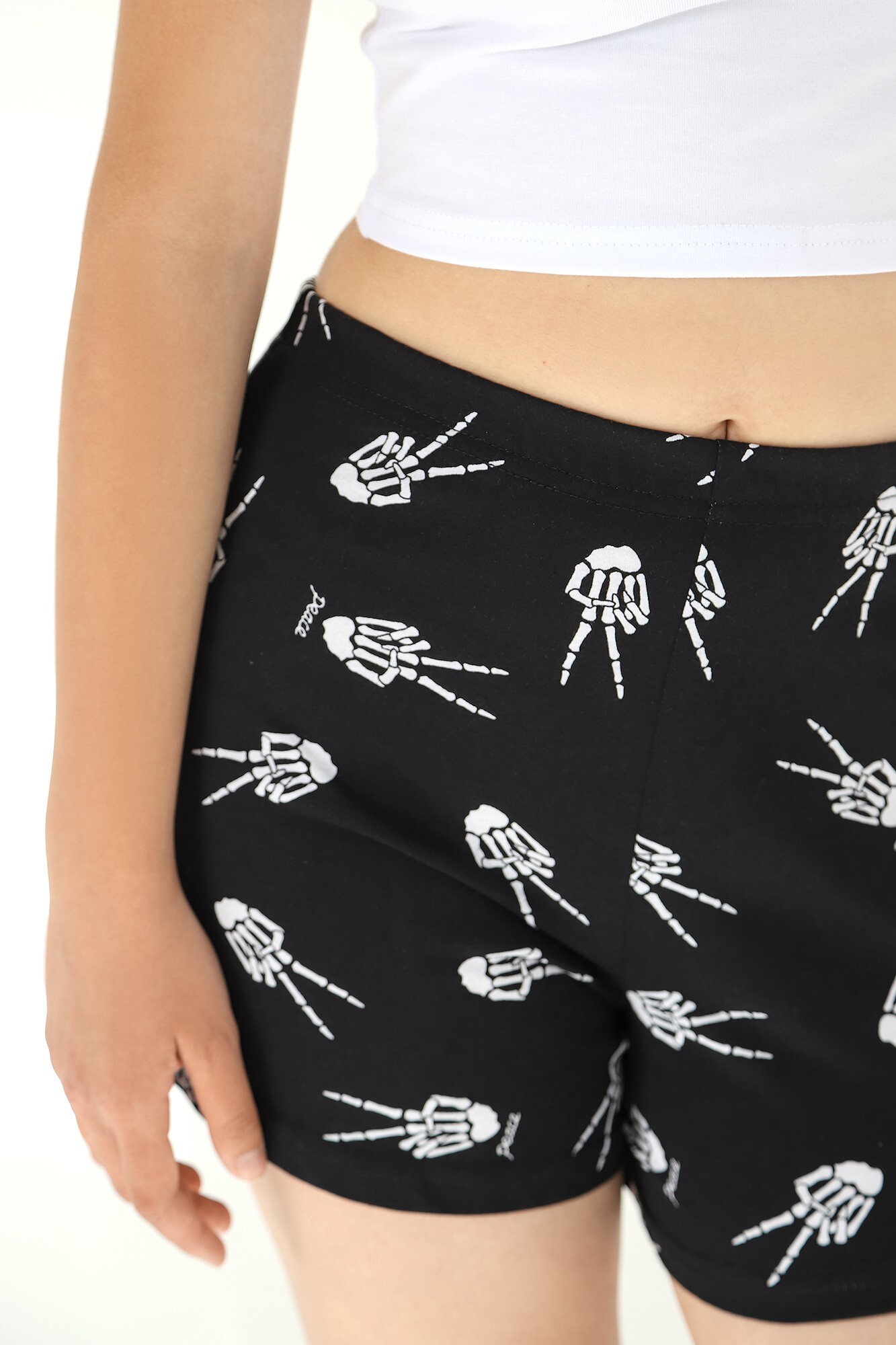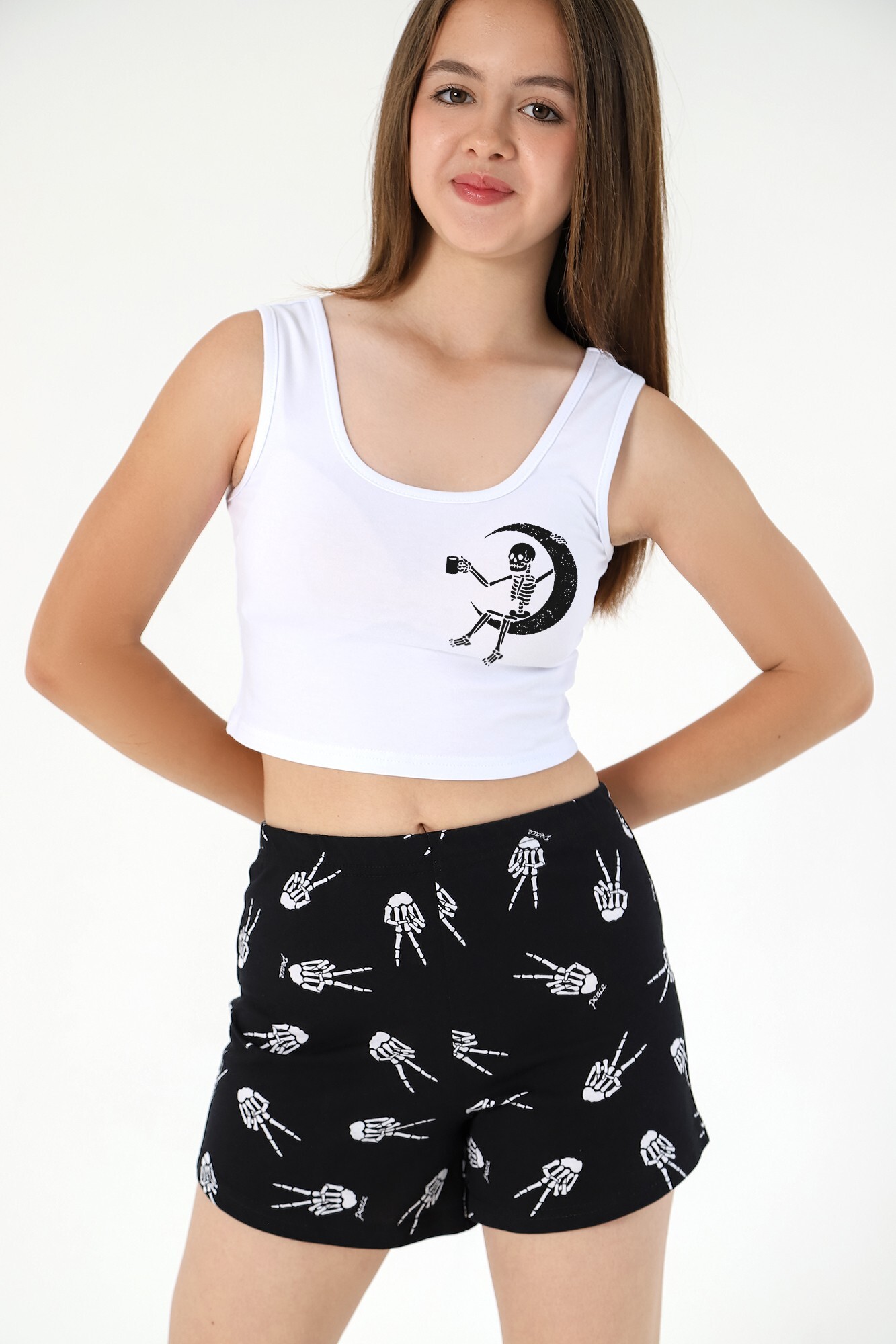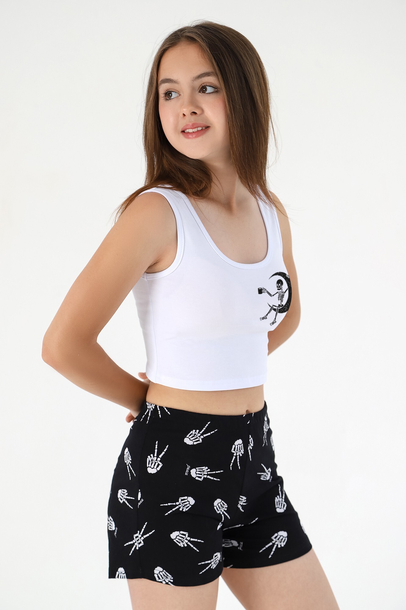 Подростковый костюм для девочки. Майка плотно прилегающая, укороченная, с принтом. Шорты из полотна эксклюзивного дизайна, расширенные к низу, с эластичной тесьмой по линии талии.