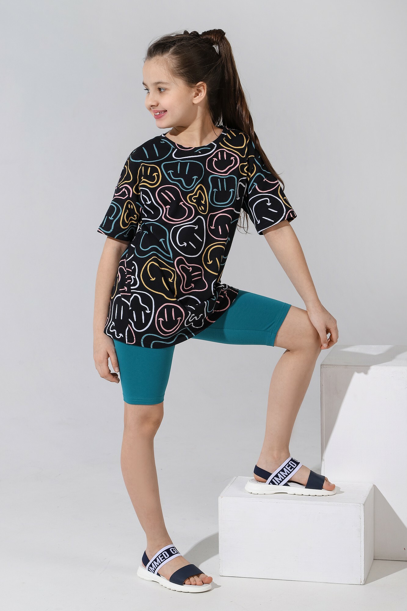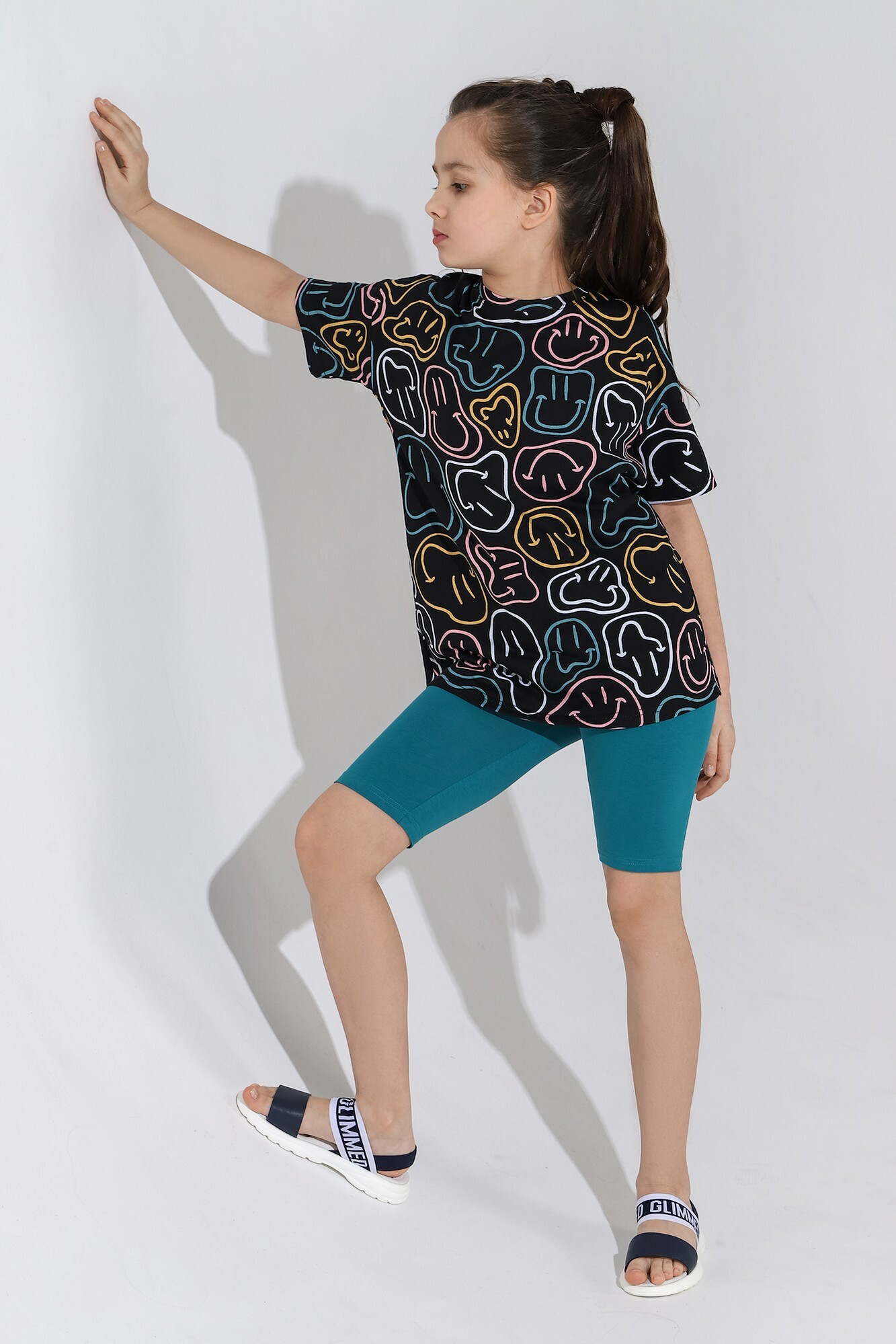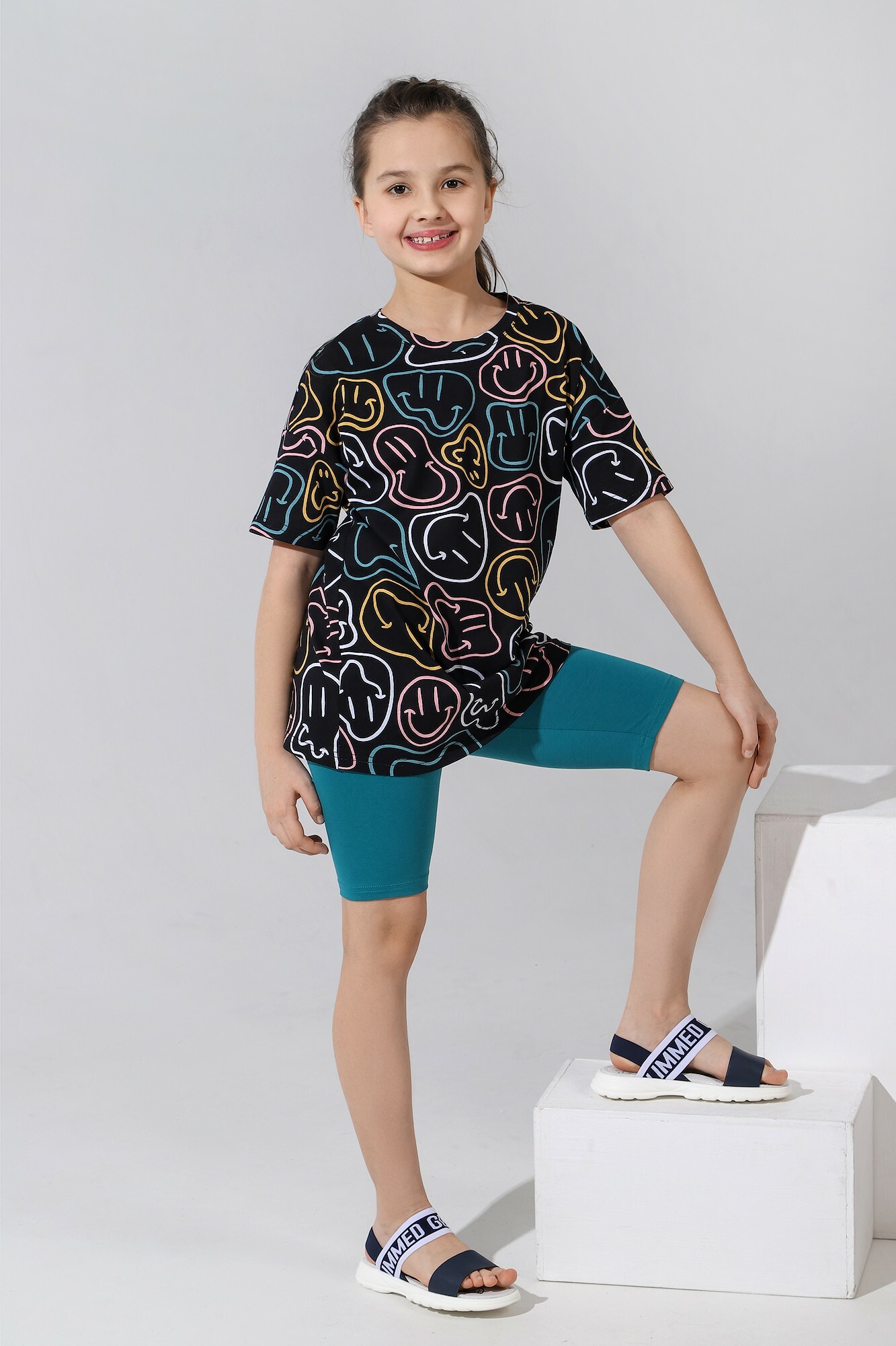 Модный и удобный костюм для девочки. Футболка свободная, удлиненная, со спущенной линией плеч, выполненная из хлопкового полотна с набивным рисунком эксклюзивного дизайна. Бриджи однотонные из хлопкового полотна с лайкрой прилегающего силуэта, длиной выше колен ("велосипедки") .