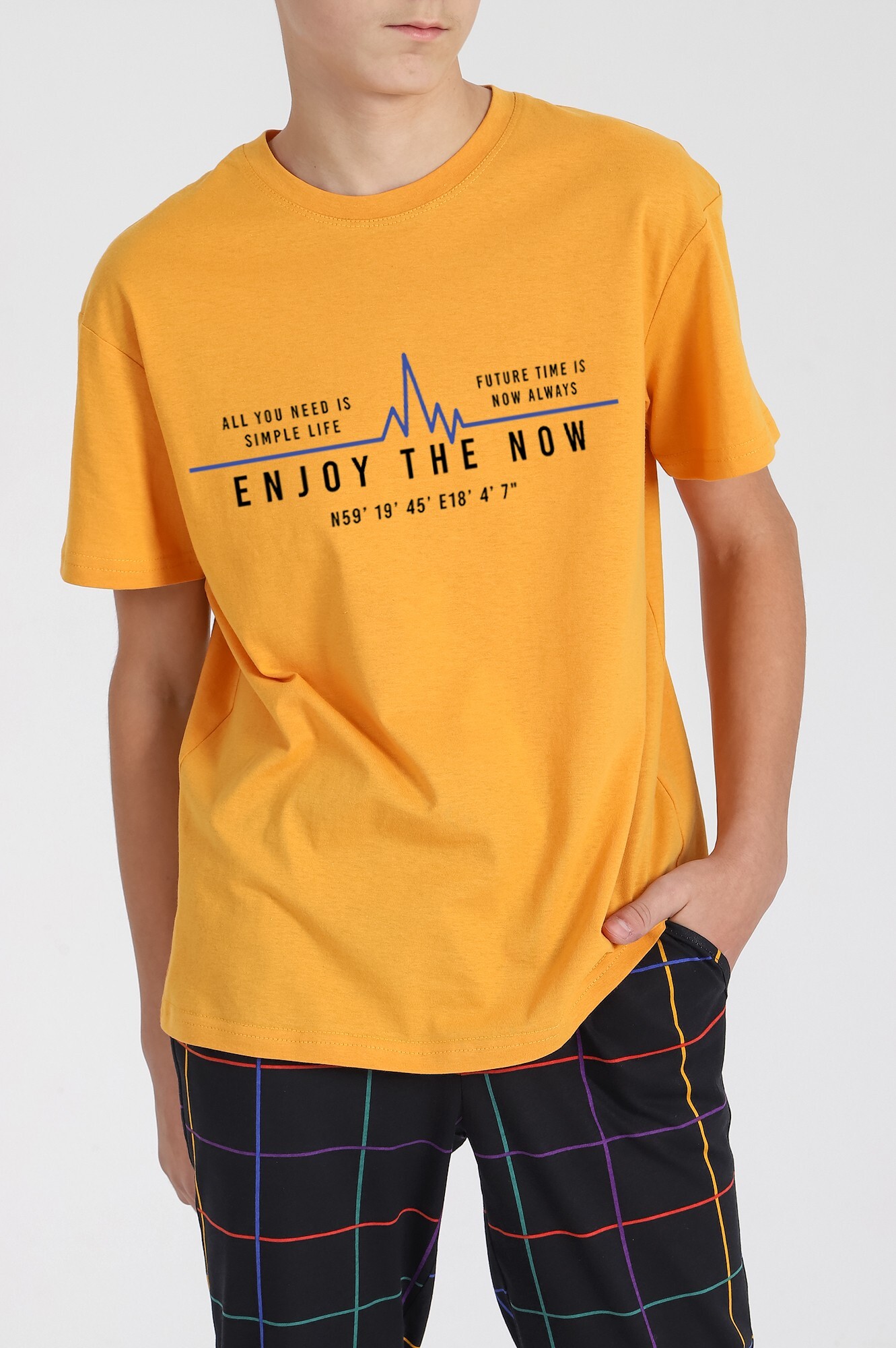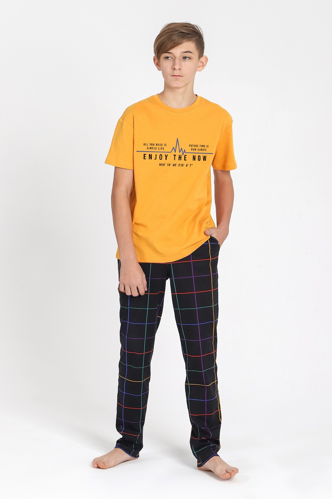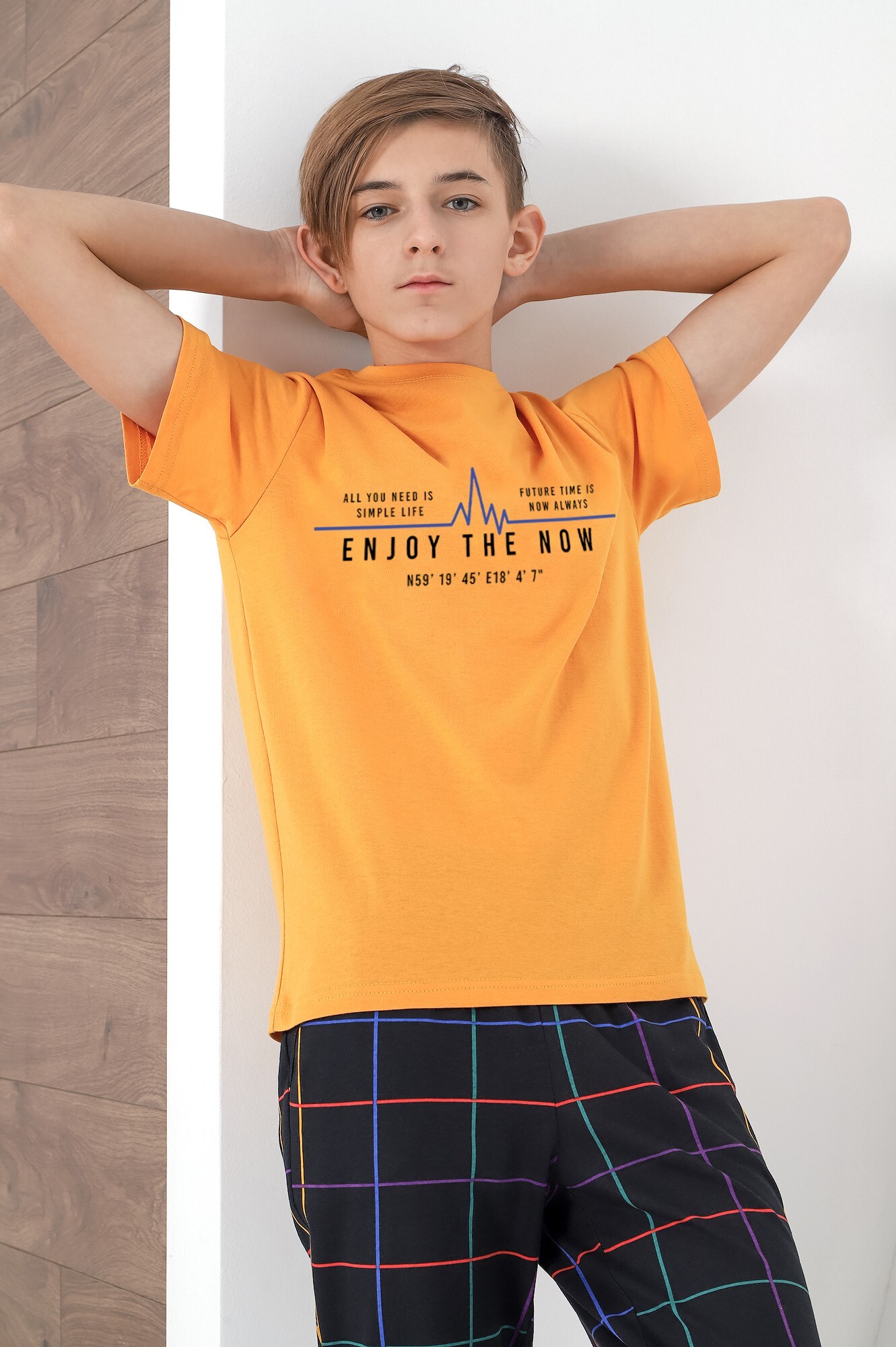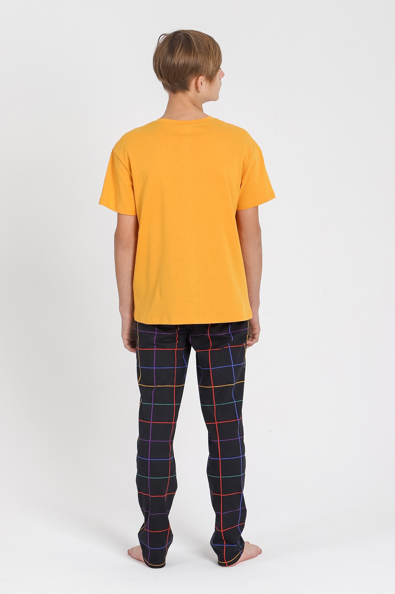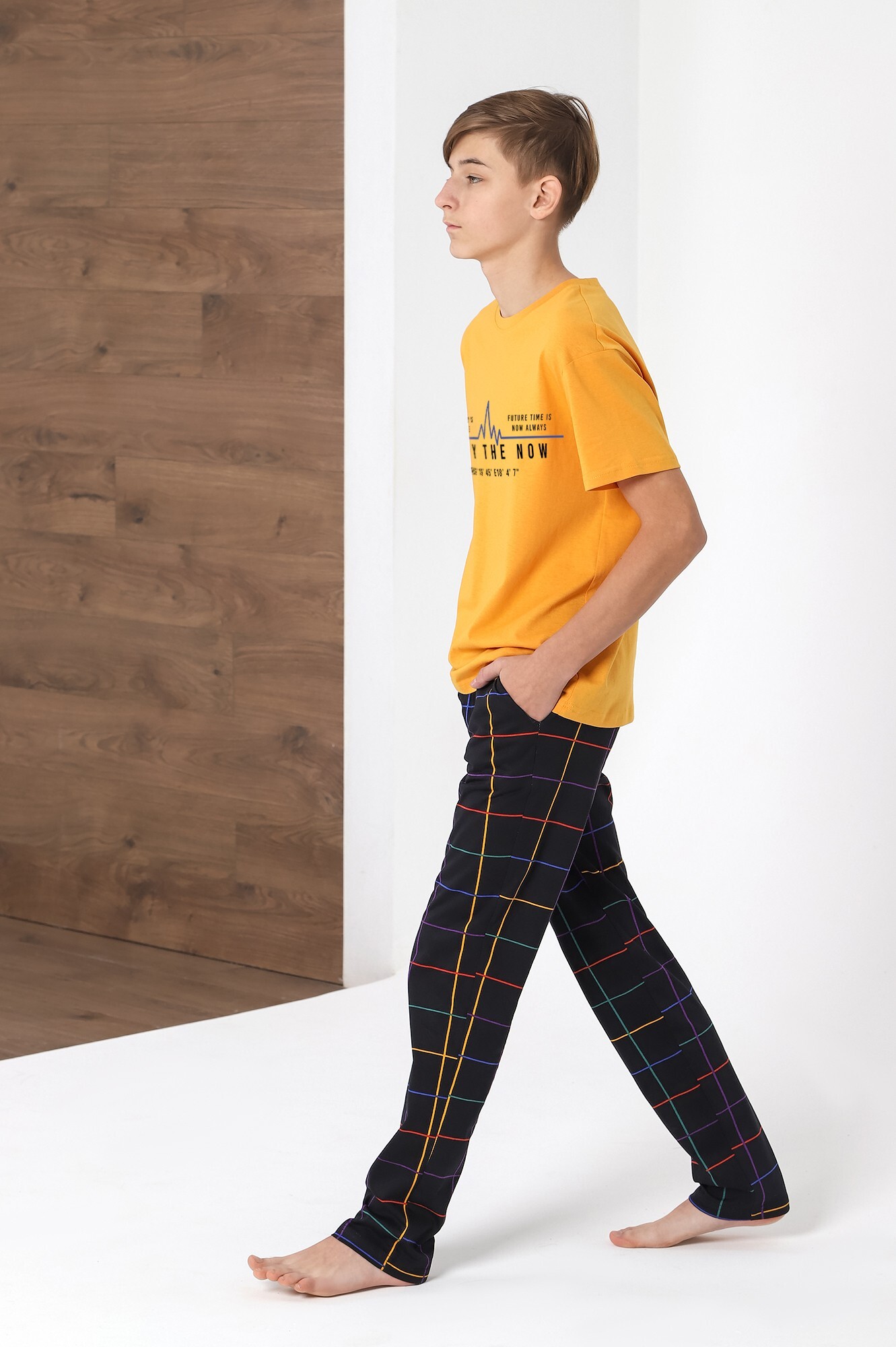 Подростковый костюм для мальчика из хлопчатобумажных трикотажных полотен кулирного переплетения. Однотонная футболка о слегка спущенной линией плеч, округлым вырезом горловины, с принтом. Брюки из полотна эксклюзивного дизайна, прямые, на притачном поясе с отстроченной эластичной тесьмой, с боковыми карманами.