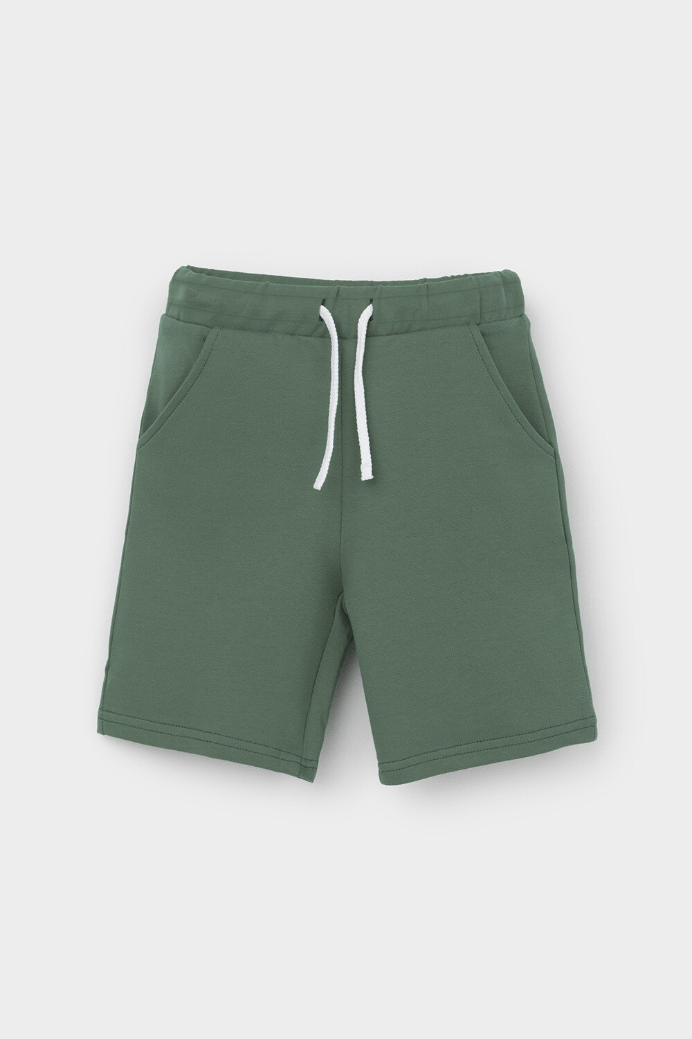 Трикотажные шорты для мальчика из петельчатого футера. Эластичный пояс на резинке регулируется по ширине с помощью шнурка, по бокам два удобных кармана.