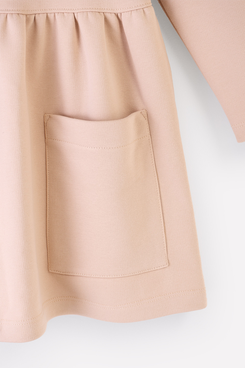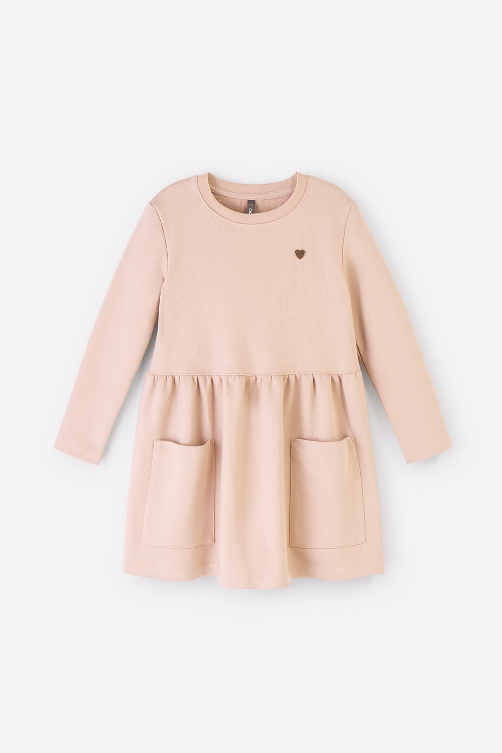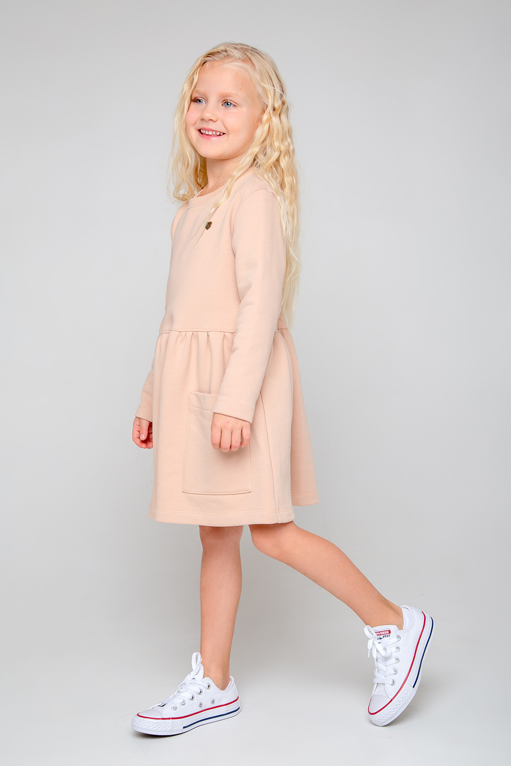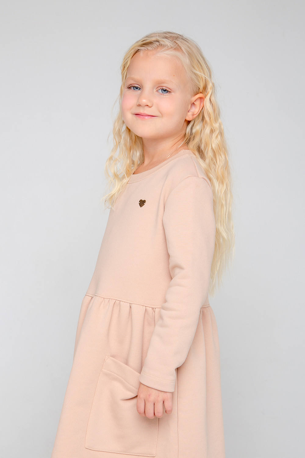 Платье для девочки из петельчатого футера трехнитки, произведенного из натурального хлопка. Изделие имеет длинные втачные рукава, сборку по талии и накладные карманы. Для удобства в размерах 92 и 98 имеется застежка на кнопки на плече. Платье сохраняет цвет и форму после многократных стирок.